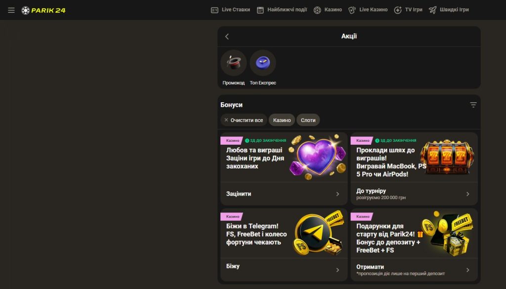 Основна пропозиція для новачків у parik 24 — це вітальний бонус 100% до 10 000 UAH на перший депозит. Це найбільш вигідна пропозиція для нових гравців, яка дозволяє подвоїти стартовий банкролл.